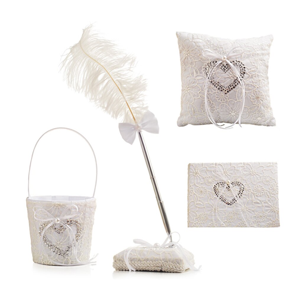 Wedding Ceremony Party Set Wedding Ring Pillow Flower Girls Basket Guest Book Feather Pen Set Bridal Decoration Supplies